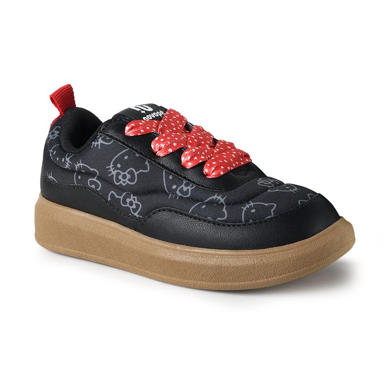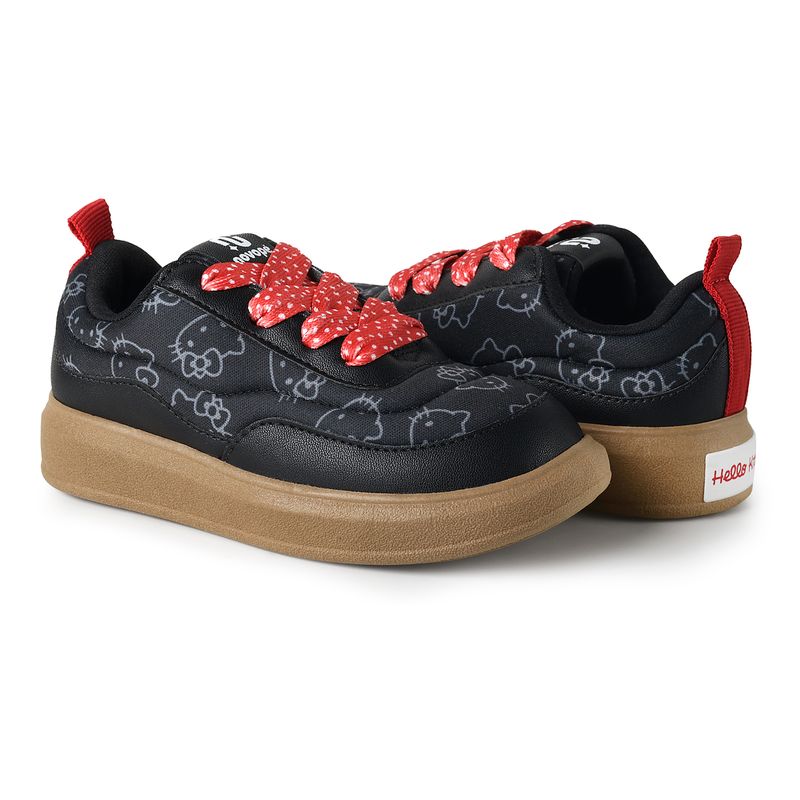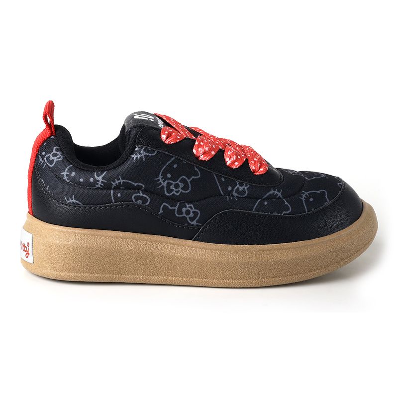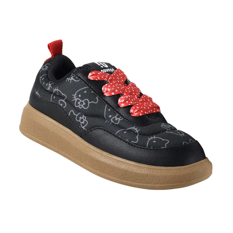 A estampa oficial da Hello Kitty aparece em traços delicados no cabedal preto, contrastando com o destaque dos cadarços vermelhos de poá, inspirados no icônico laço da personagem. O resultado é um visual moderno, divertido e cheio de energia!
