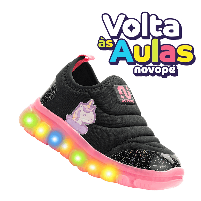 Tênis Infantil Novopé com LED Unicórnio Preto com Pink